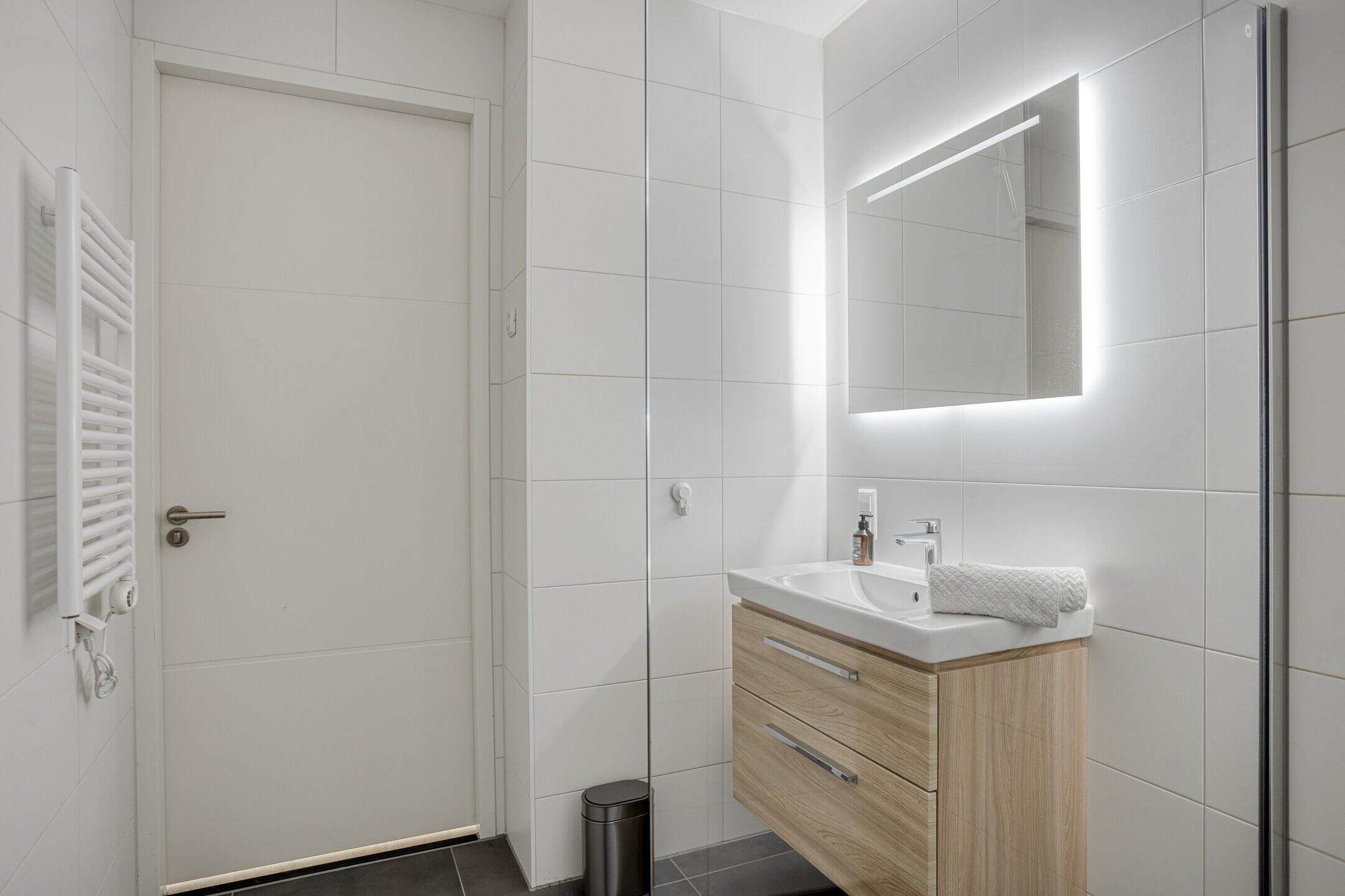 - Douche, wastafel, wastafelmeubel, inloopdouche, vloerverwarming