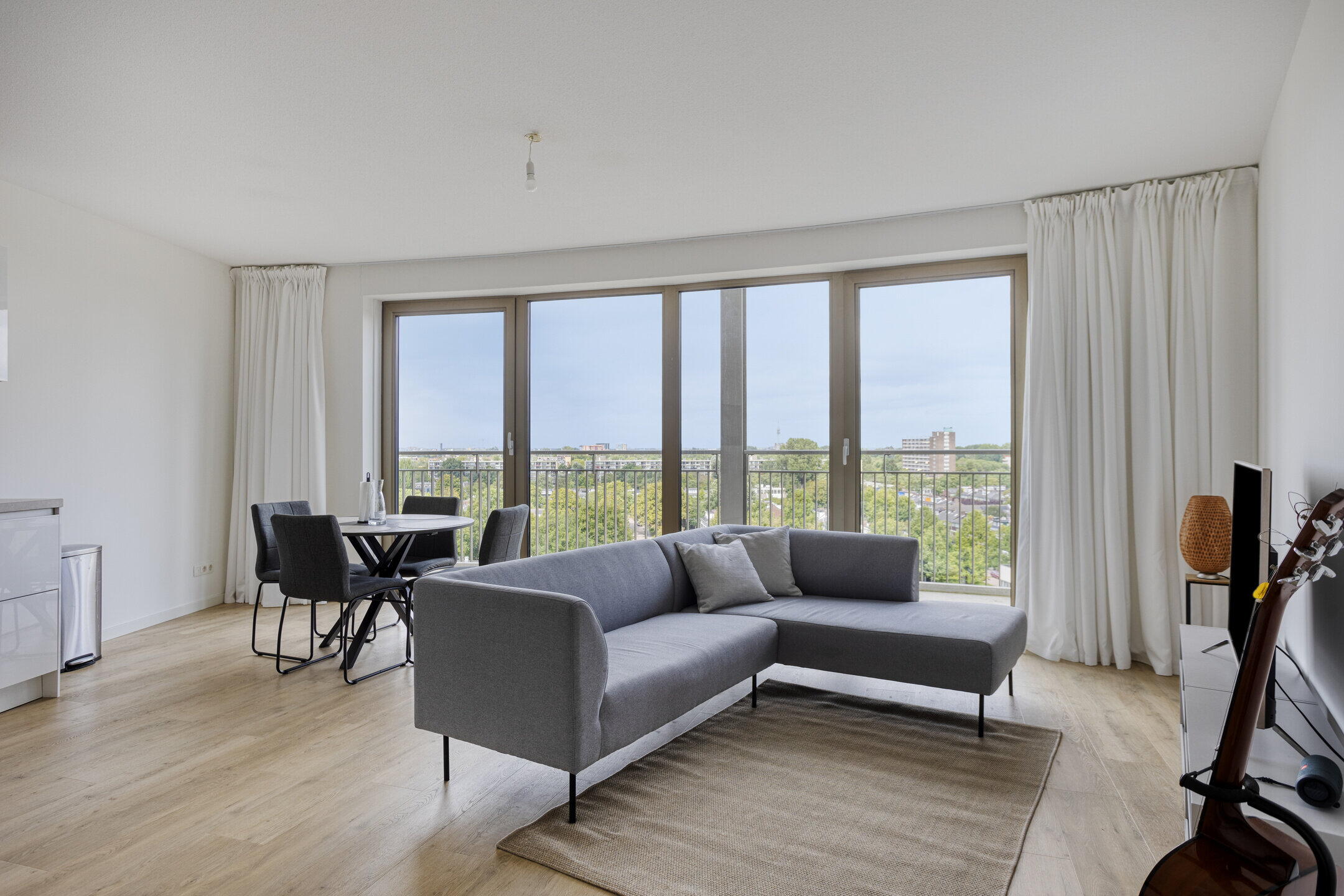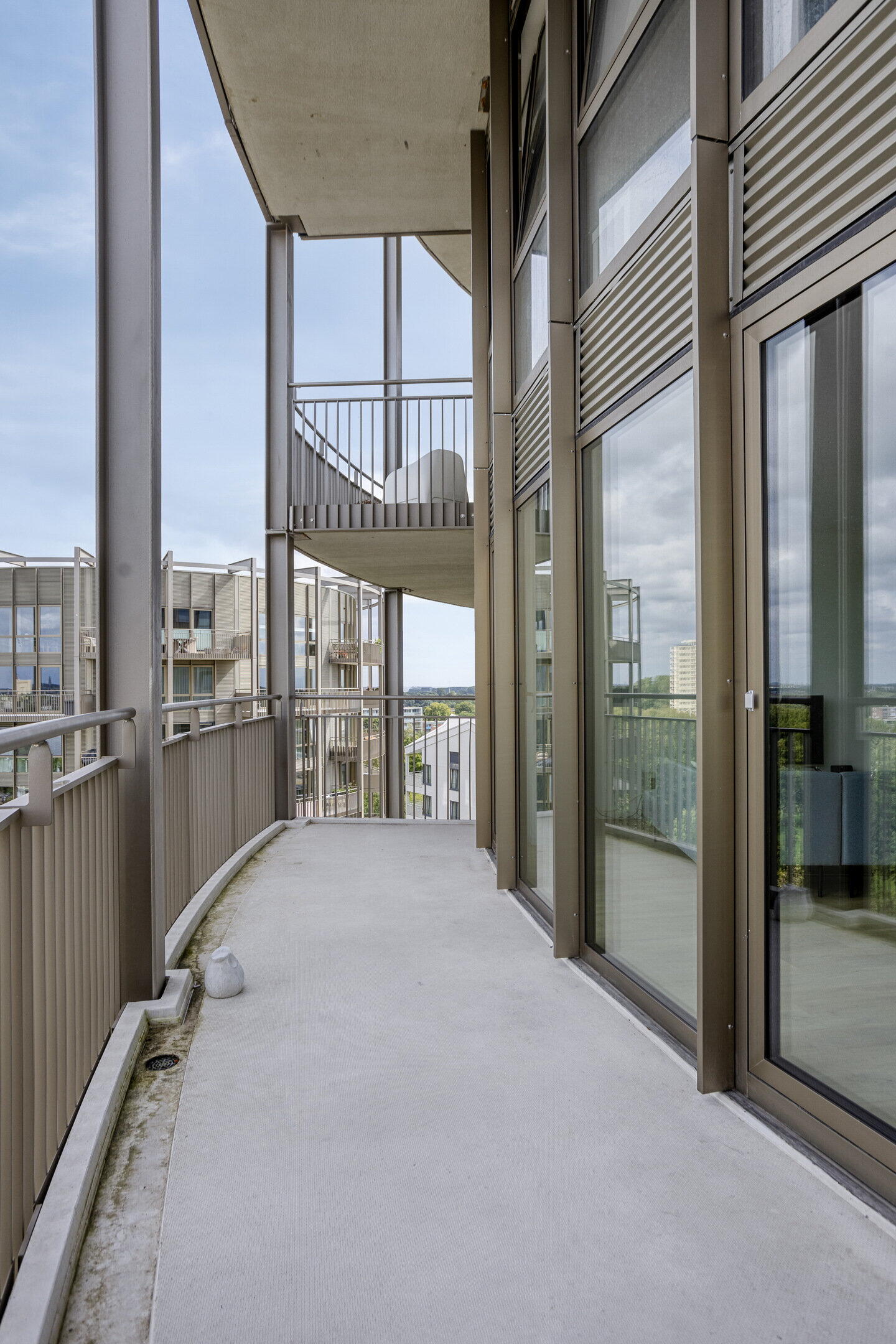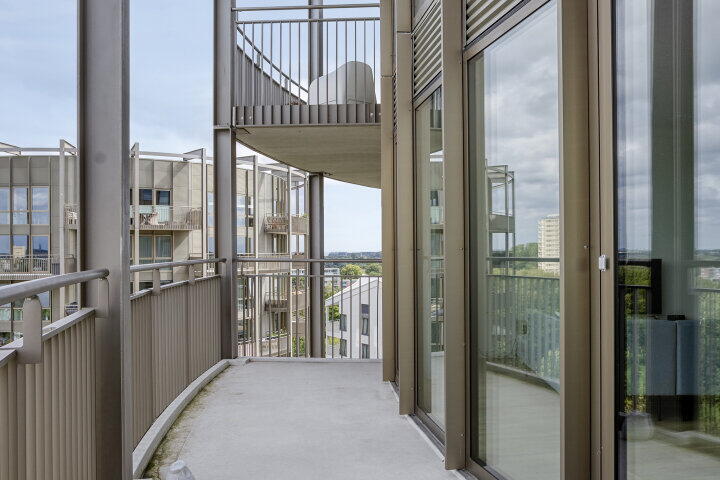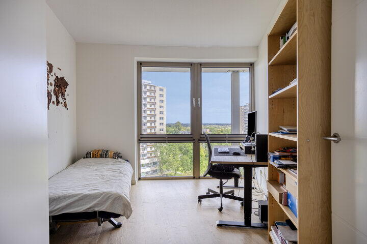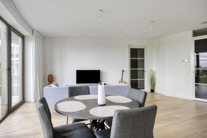 De open woonkamer met grote raampartijen en dubbele toegang tot het terrasbalkon zorgt voor veel natuurlijk licht en een ruimtelijk gevoel. De moderne keuken is voorzien van hoogwaardige apparatuur en biedt voldoende ruimte om te koken en te dineren. De twee slaapkamers liggen rustig en bieden uitzicht over het groen. Het terrasbalkon is ideaal om te ontspannen en te genieten van de zon.